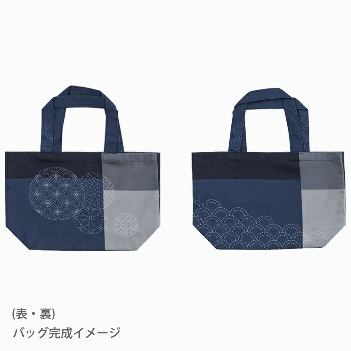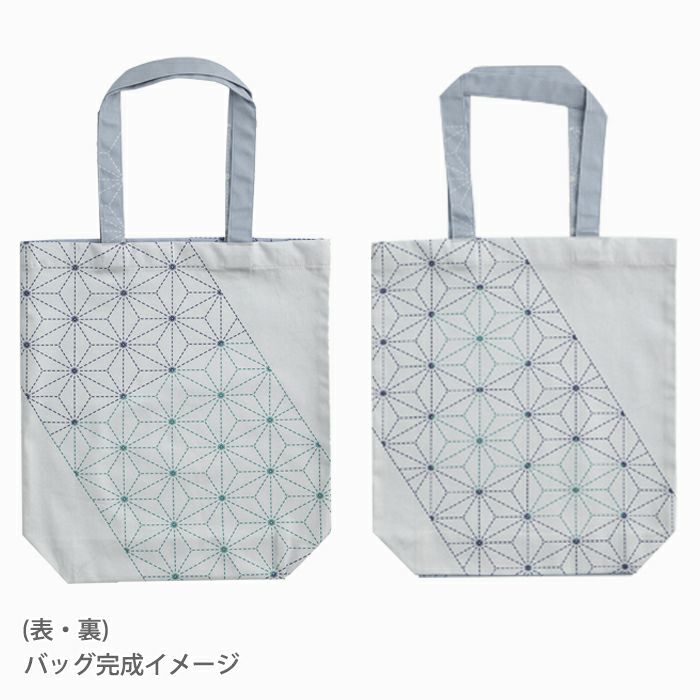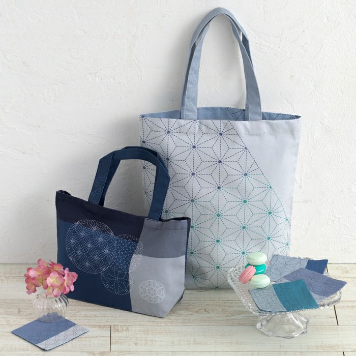 裁断して縫うだけで、2種類のバッグと、コースター4枚をつくれるパネル生地です。ほどよい厚みのオックス生地に、麻の葉や青海波など刺し子で人気の伝統柄をアレンジしたホビーラホビーレのオリジナル柄がプリントされています。