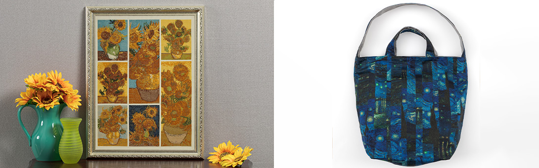 7 種類の「ひまわり」を丁寧にクロスステッチで再現した〈ゴッホコレクション〉、 名画をモチーフにした個性あふれる3 種の新作テキスタイル、編み物ではトートバッグ〈星月夜〉をご紹介。