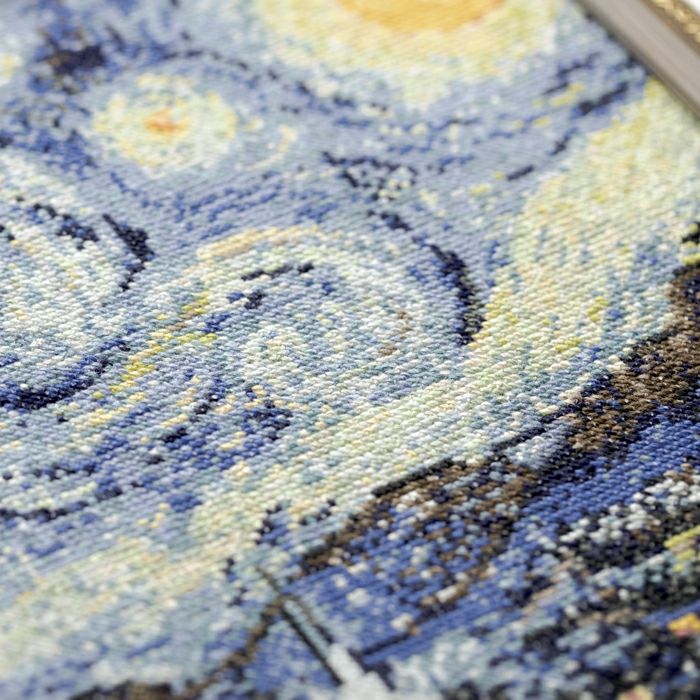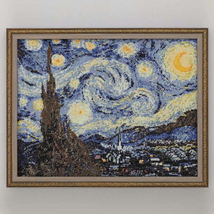 ニューヨーク近代美術館所蔵のゴッホの代表作『星月夜』をクロスステッチで。夜空と大きな糸杉の情景を、繊細な色合いと息づく筆致で表現する刺しゅうキット。芸術と手仕事の魅力を味わえる、刺しごたえたっぷりの一品です。