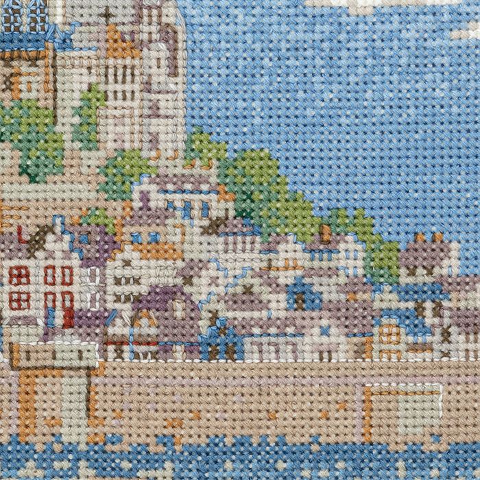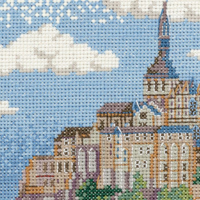 幻想的な美しさで有名な世界遺産サン・マロ湾に浮かぶモン・サン=ミシェルをシックな配色でクロスステッチ。歴史的な修道院の建物部分はバックステッチを入れて奥行き感を表現します。