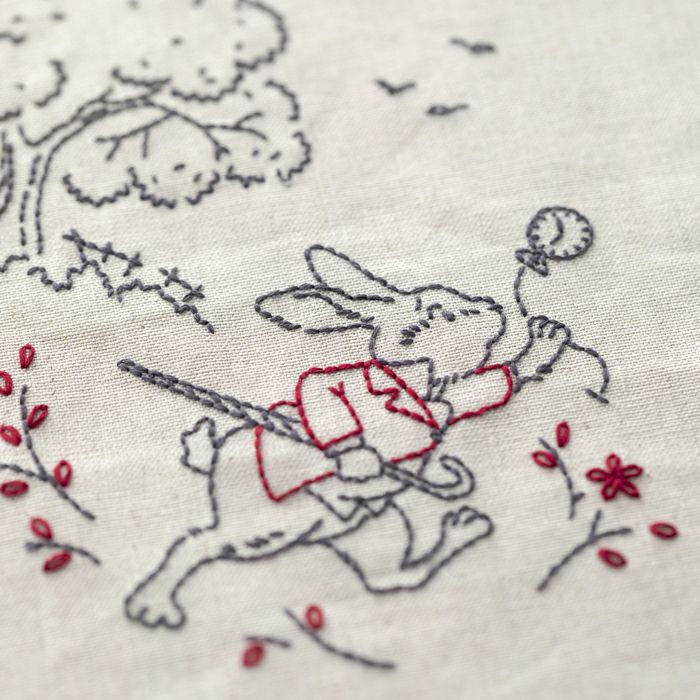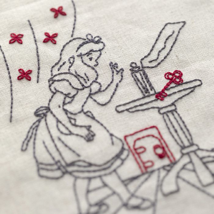 ナチュラルなハーフリネンの土台にチャコールグレーと濃い赤の2色で物語の印象的なシーンをシンプルにステッチします。用途や飾る場所を選ばない落ち着いた仕上がりが魅力。
