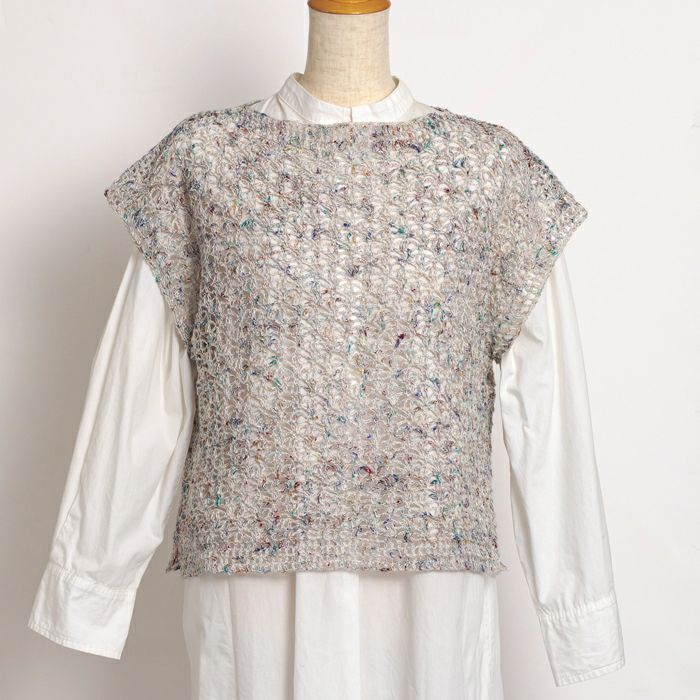 増減のない模様編みの身頃2枚をとじ合わせる、サイドスリット入りセーター。カラフルなネップとナチュラルな風合いのリネンをミックスしたメランジ感のある糸で編む、ベストにもなる軽やかなアイテムです。