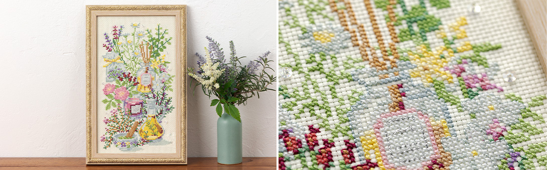 さまざまなハーブやアロマグッズをモチーフにしたクロスステッチフレームと 16 種類のハーブを刺しゅうで表現したステッチクロスなどを発売します。