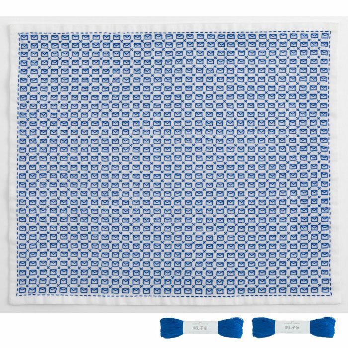 ダイヤモンド貼りの小さな洋封筒のモチーフが並んだ一目刺しのデザイン。くっきり形が浮き上がる単色糸で刺すのがおすすめ。手紙に添えてプレゼントしても喜ばれます。こちらは刺し子布と刺し子糸のセットです。