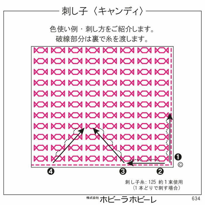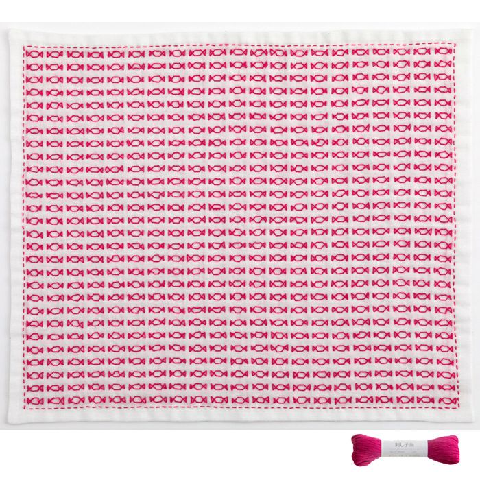 キャンディ包みの飴がたくさん並んだお菓子柄。一目刺しで刺せるデザインをローズピンクの糸で刺し上げます。どんな色で刺しても可愛いので、お好みの色でアレンジしても。こちらは刺し子布と刺し子糸のセットです。