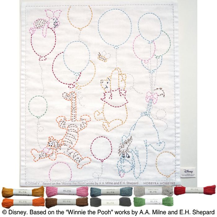 くまのプーさんと森のなかまたちが、カラフルな風船にぶら下がって空を飛ぶ楽しいデザイン。9色の刺し子糸でイラストを描くように刺していきます。プーさんファンへのギフトにも。