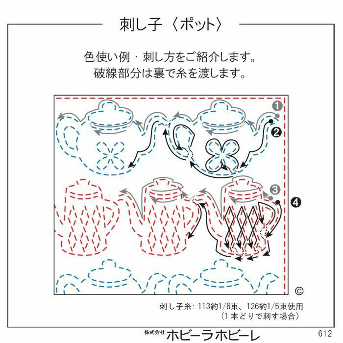2種類のポットの連続模様を濃ブルーとストロベリーレッドの糸でボーダー柄に刺しあげます。刺すときには、右から左、左から右へと色ごとに続けて刺すことができるのもポイント。