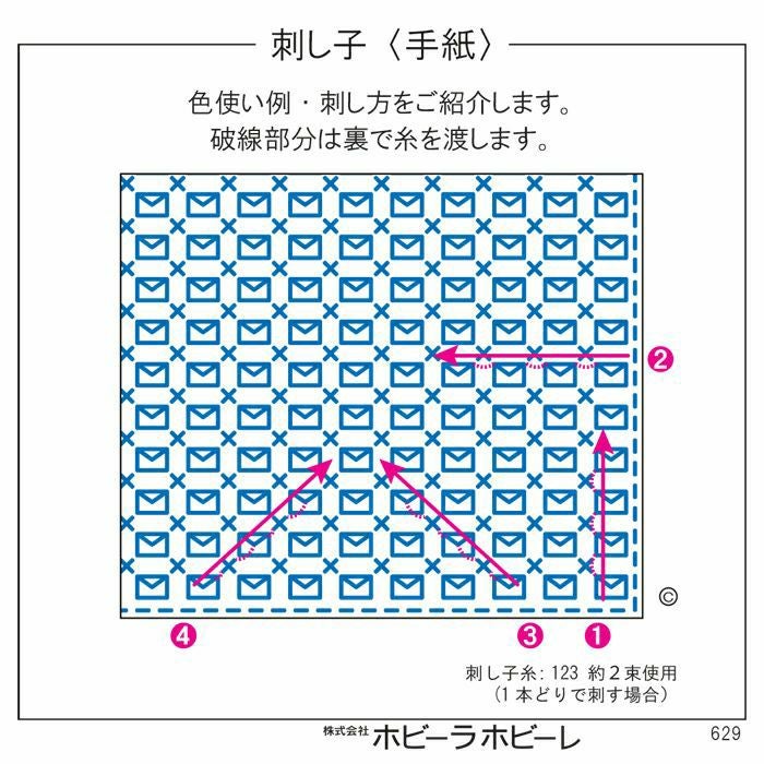 ダイヤモンド貼りの小さな洋封筒のモチーフが並んだ一目刺しのデザイン。くっきり形が浮き上がる単色糸で刺すのがおすすめ。手紙に添えてプレゼントしても喜ばれます。こちらは刺し子布と刺し子糸のセットです。