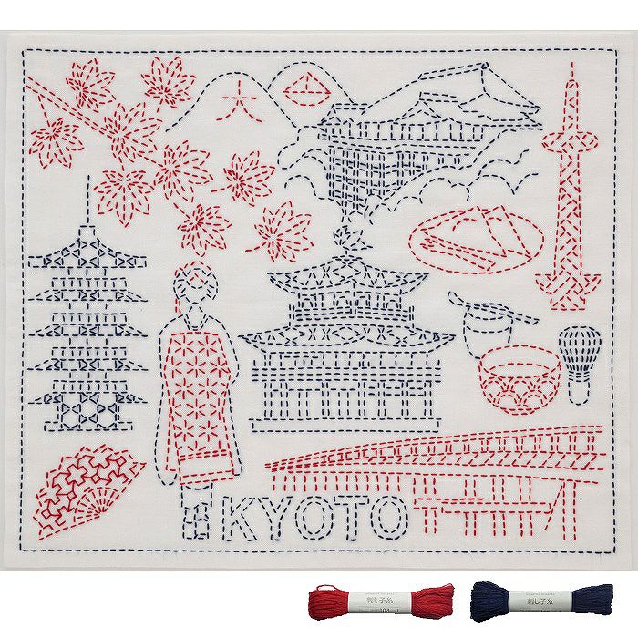 国内各地の魅力をパターンに盛り込んだご当地シリーズの一枚。観光地として大人気の京都をテーマに、名所、歴史的建造物、和文化、銘菓などを2色の刺し子糸で表現。