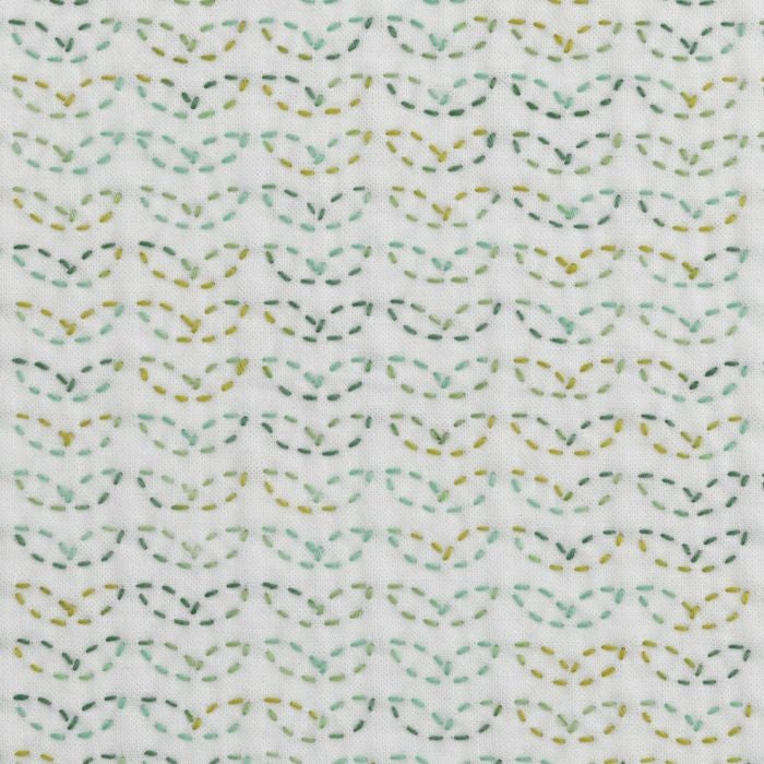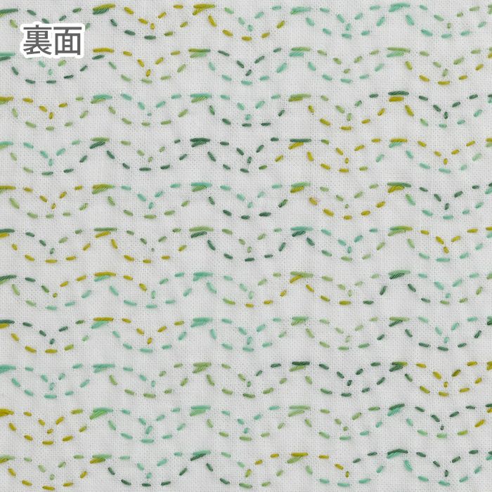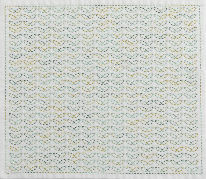 芽吹いたばかりのふたばの連続柄。ぼかし若草色の刺し子糸でご提案する、キッチンやリビングに使いたい愛らしい柄。一列ごとにグリーン系濃淡で刺し替えても素敵です。