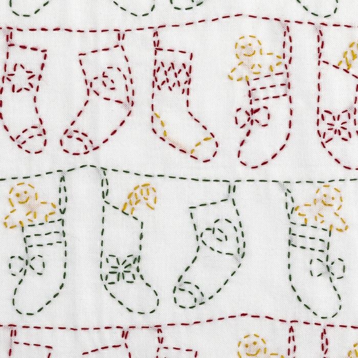 赤と緑のクリスマスカラーで横一列にソックスを刺し、カラシ色でジンジャー人形やステッキ型キャンディーをステッチしてカラフルに。クリスマスのデコレーションやギフトにおすすめ。