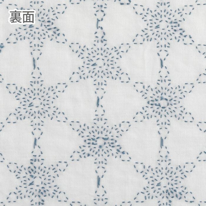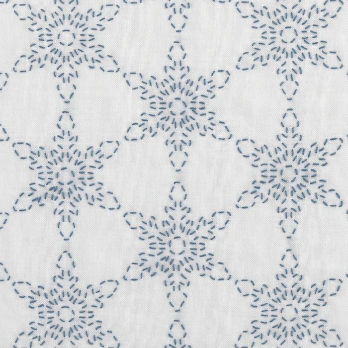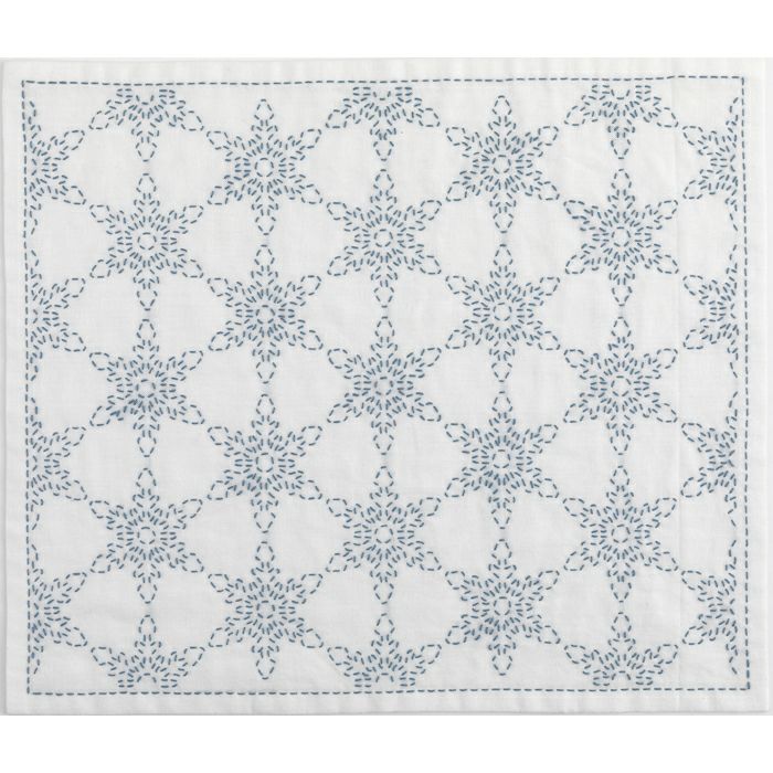 六角形の雪の結晶をモチーフにしたオリジナル柄。濃ブルーの刺し子糸のご提案で、刺したモチーフの余白が6弁の花のようにも見えるデザイン。冬のダイニングやリビングに。