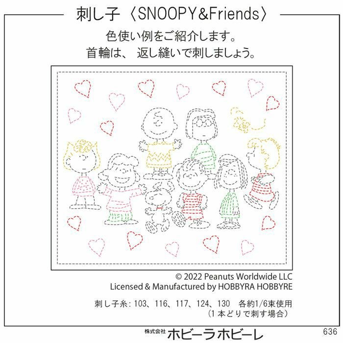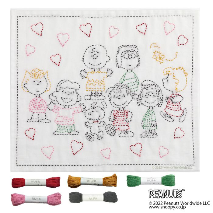 チャーリー・ブラウンとスヌーピーを真ん中に、愛にあふれた仲間たちが集まった図柄を5色の刺し子糸でカラフルに刺し上げるクロス。飾ったり、包んだり、様々な用途に使えます。こちらは刺し子布と刺し子糸のセットです。