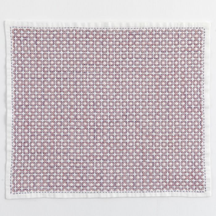 折り紙を重ねたイメージの図柄を人気の一目刺しの技法で仕上げるオリジナル柄。緻密な幾何学柄を刺し上げたときの達成感はひとしお。刺し子糸の色を変えても様々な雰囲気が楽しめます。