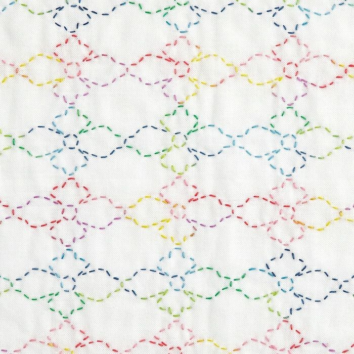 菱形の周囲を花弁の形に図案化した花菱は、婚礼などにも使われる柄で、菱は生命力の強さから子孫繁栄や無病息災の意味も込められています。2種のぼかし糸を使い、一列ごとに糸を替えて刺し分けるカラフル感が楽しい1枚です。