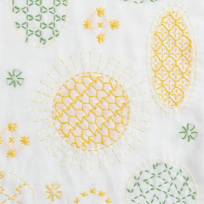 ランダムに配置した大小の楕円や円形をいろいろな伝統柄で刺し埋めるモダンな寄せ模様。春に芽吹く草花のようなカラーリングで、モチーフごとに糸始末をしながら仕上げます。