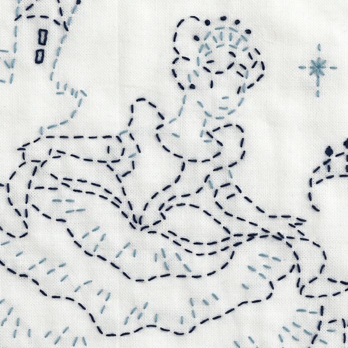 誰もが知る童話の世界を刺し子の運針とフランス刺しゅうの技法で楽しむ刺し子布巾。シンデレラのイメージカラーのブルーの濃淡で、清らかで心優しいヒロインを表現します。