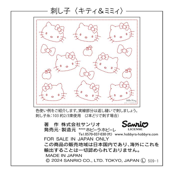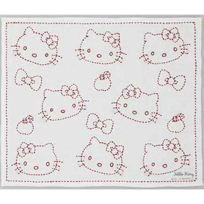 2014年発売の商品を復刻したアイテム。ハローキティとミミィの顔とシンボルモチーフをアイコンのように配置。シンプルな赤糸1色刺しで、初心者にも刺しやすい図柄です。
