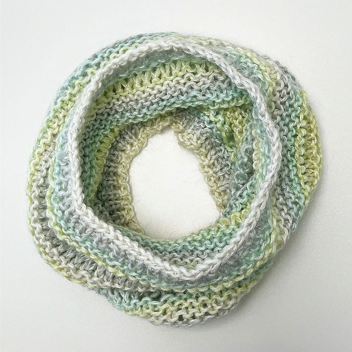 淡く移ろうグラデーションに染め上げたシルクとウールの混紡糸に、コットン糸、モヘヤ糸、ラメ糸を添えて、奥行きのあるふんわりとした彩りに仕上げました。