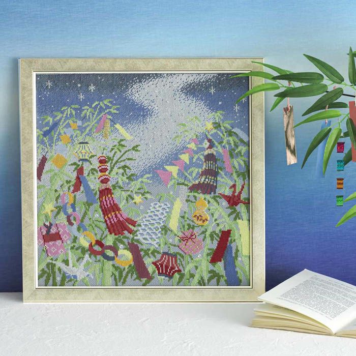 天の川が静かに流れる夏の夜空と笹飾りが風にそよぐ幻想的な情景をクロスステッチで表現。笹飾りごしに仰ぎ見る構図が印象的なデザインです。落ち着きのある色つきの布と、繊細なハーフステッチで描く空と天の川が大人の夏を演出します。シルバーフレームが夜空のきらめきを引き立てる刺しゅうキット。