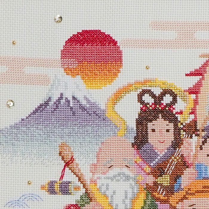 福を招く七福神がにこやかな表情で宝舟に乗る縁起の良いデザイン。背景には雄大な富士山と美しい日の出が描かれ、お正月らしい晴れやかな情景を刺しゅうで楽しめます。