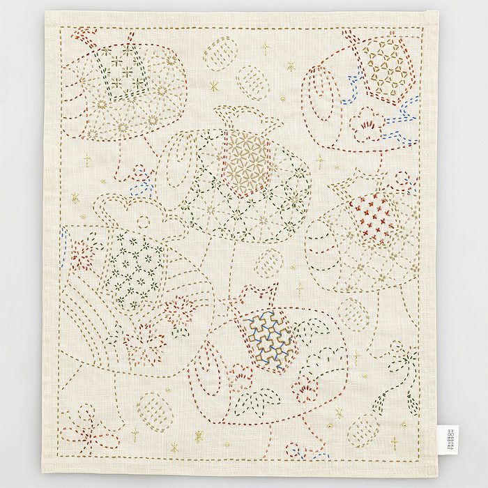 セット内容印刷線入り布(綿100%)/刺し子糸1種(綿93%、ポリエステル4%、ナイロン3%)/刺し子糸4種(綿100%)/ラメ糸(キュプラ63%、ポリエステル37%)/ビーズ/タグ(綿100%)/針と糸通し/説明書