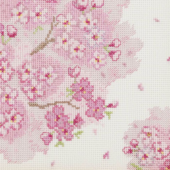 満開の桜を下から見上げた構図をクロスステッチ。空に向かって徐々に輪郭がにじむ桜の遠近感を、濃淡の桜色で繊細に表現。広がる青空との対比も印象的です。