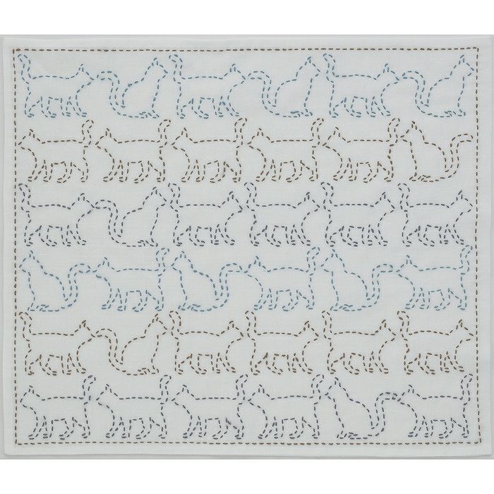 歩いたり座ったりしているねこを一列ごとに色を替え、一筆書きのようにシルエットを表現するシンプルデザイン。幅広い用途に使える、落ち着いた3色の刺し子糸で刺し上げます。
