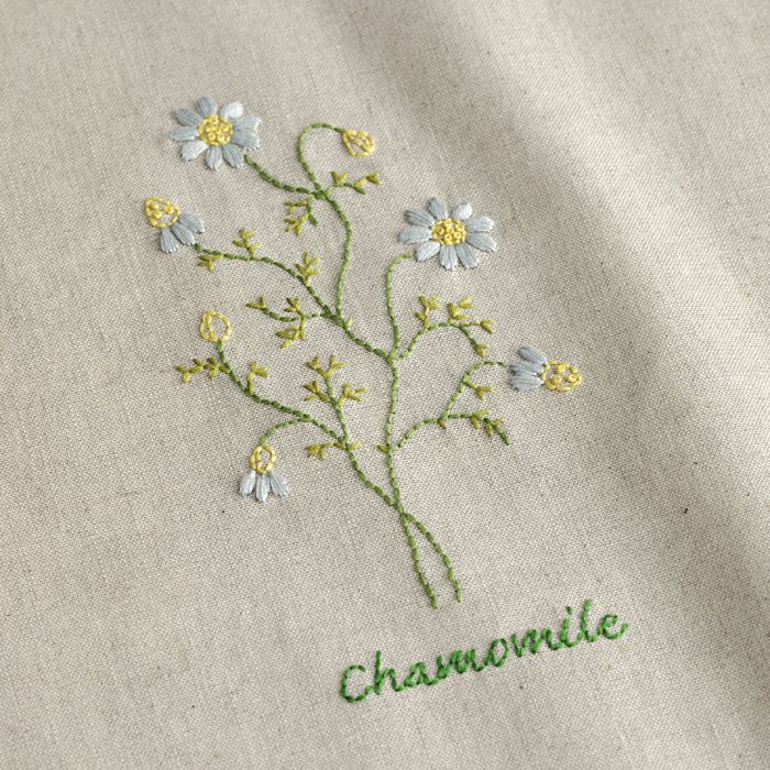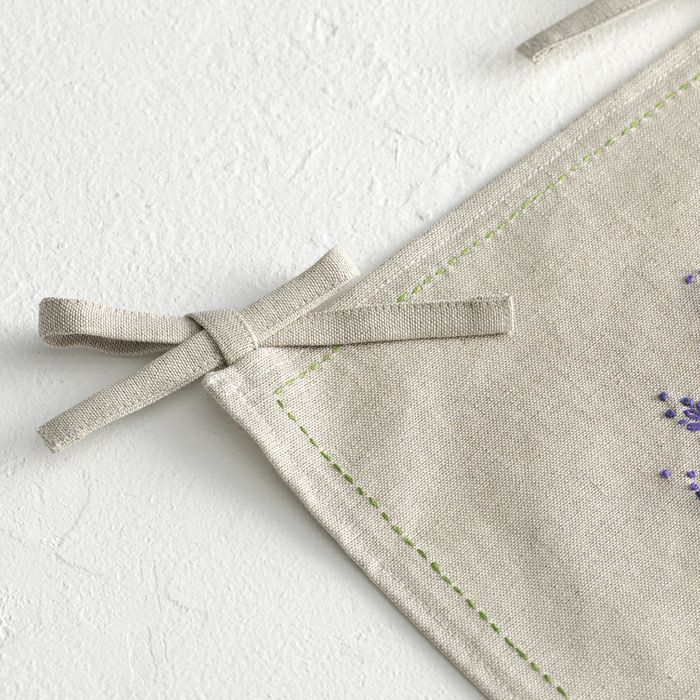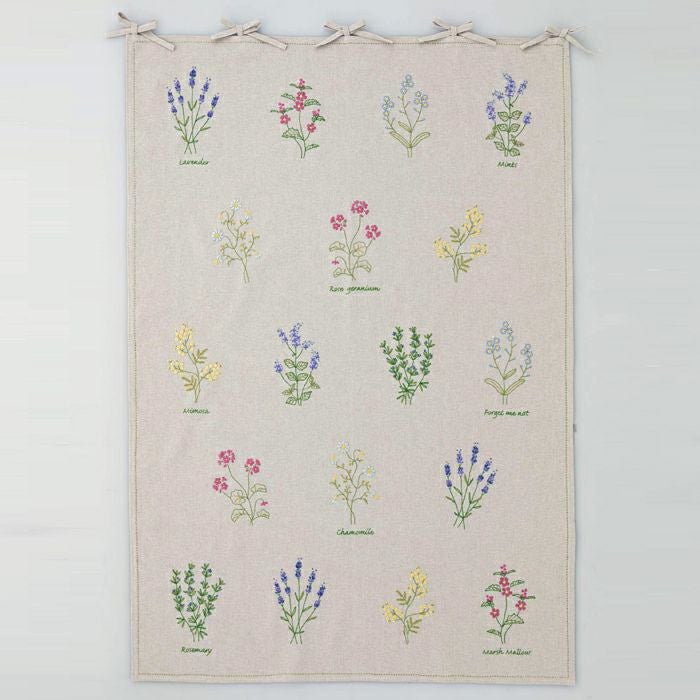 ハーフリネン2の土台布にフランス刺しゅうの多様な技法で、ラベンダー、ミントなど8種のハーブを色鮮やかにステッチ。吊り下げひもつきなので、間仕切りやのれん風な使い方も楽しめます。