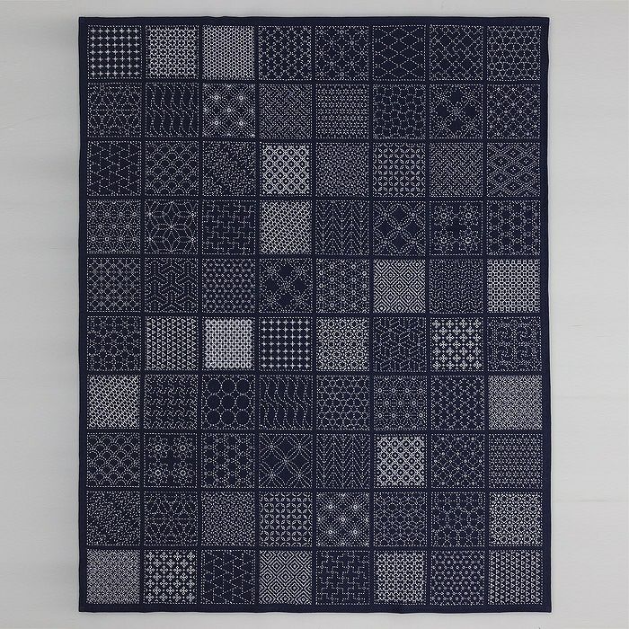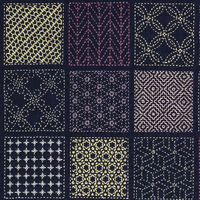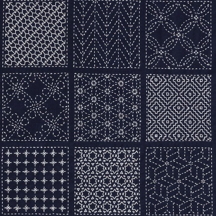 図案がプリントされた紺色のスラブコットンのみを販売。お手持ちの刺し子糸や追加糸を使って、50種の図柄をお好きな配色で刺し埋めます。正方形を均等に配置した人気の寄せ模様です。