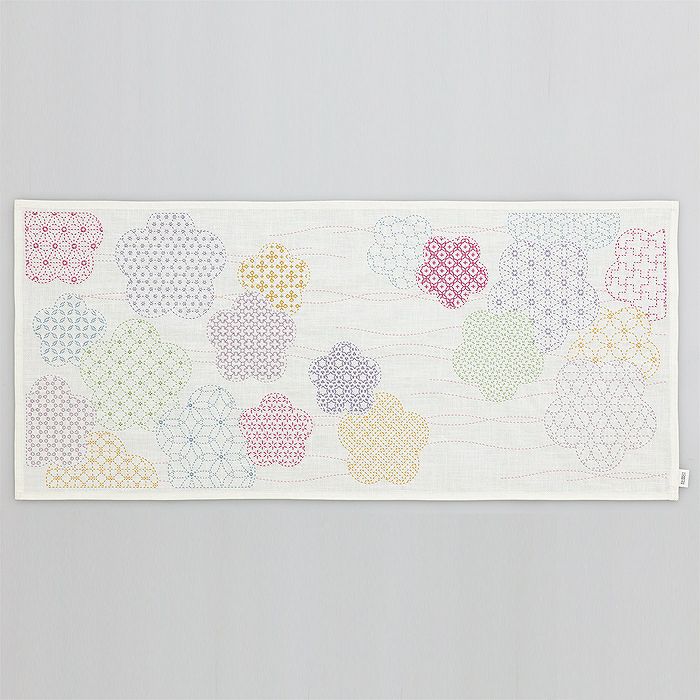 花の形の中に伝統柄、ホビーラホビーレオリジナル柄を配置し、川に浮かぶように優雅に並んだ和モダンなテーブルセンターです。和室はもちろん、洋室にもなじむデザインで、季節の演出や来客時のおもてなしに最適です。