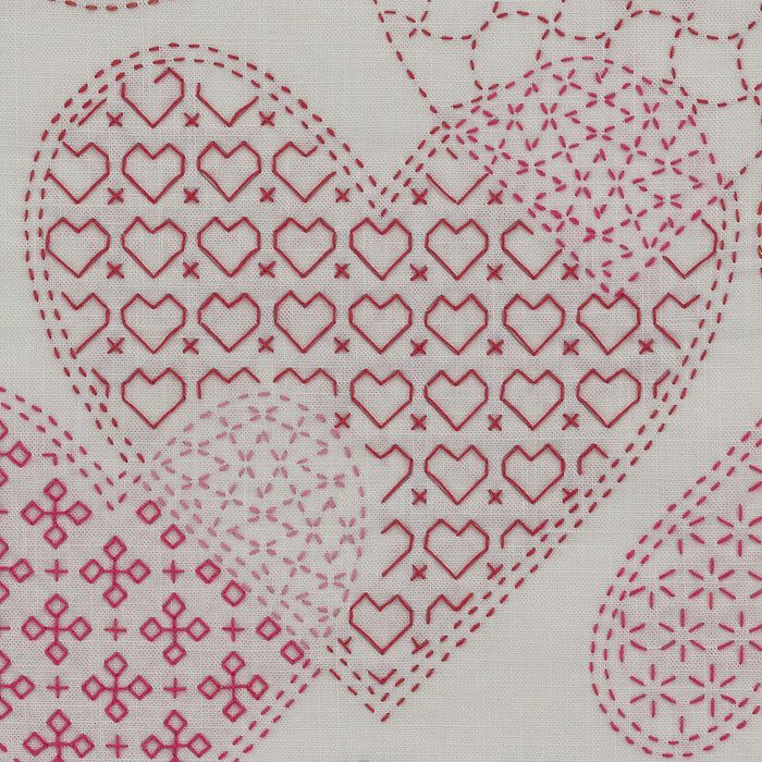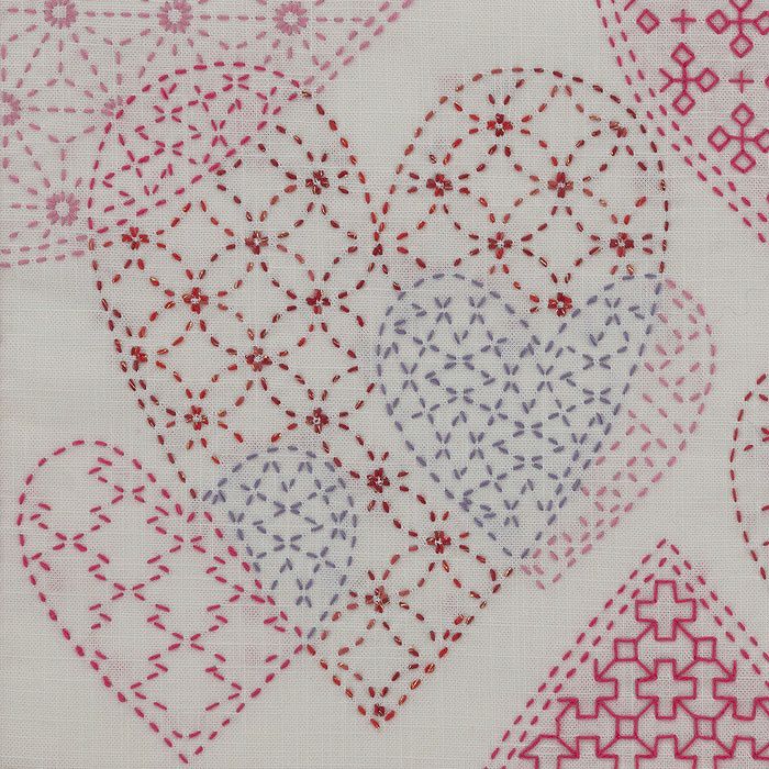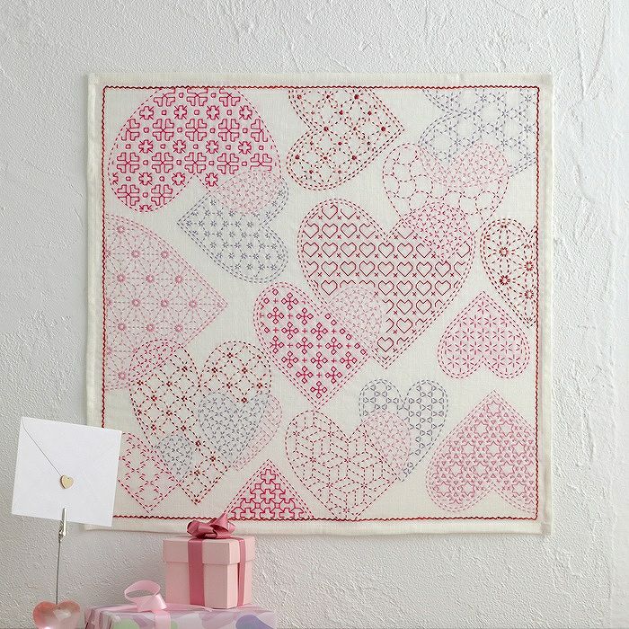 いくつものハートが重なり合って浮かんでいるような浮遊感が楽しいデザイン。ピンク系、赤系のラメ入りなど、5色の刺し子糸を使い、ハートの中を様々な図柄で刺し埋めます。
