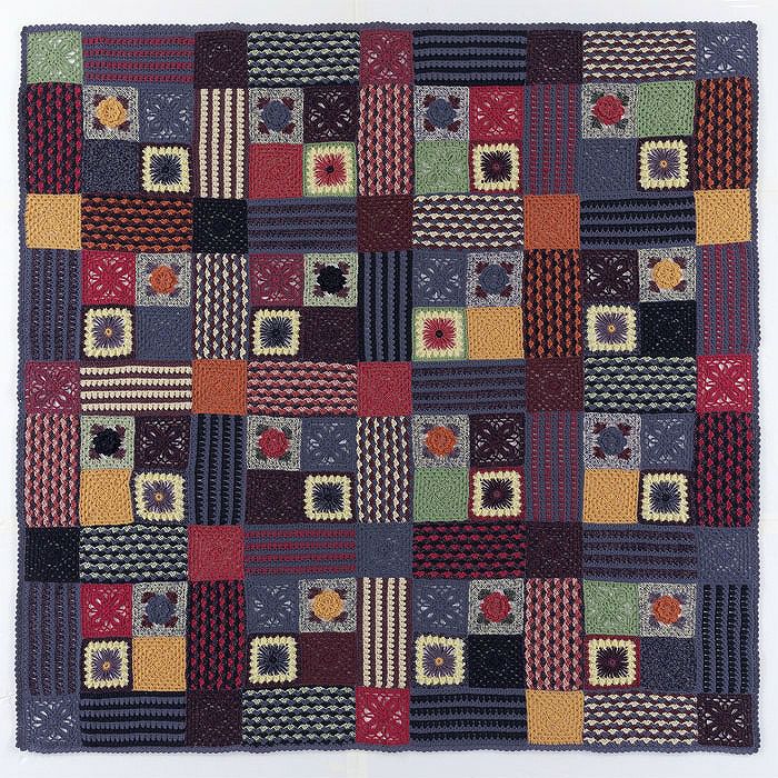 多様な模様編みの長方形と正方形のモチーフをパッチワーク状に編みつないだ大判のカラフルブランケット。秋冬のインテリアやベッドスプレッドにおすすめの、温かみのあるシックな配色で。