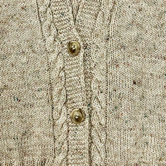 カラーネップ入りの並太糸で編むベストは、ケーブル模様と前身頃の大きめボタンがアクセント。肩の落ちたゆったりめの身頃はサイドスリット入りで、抜け感のある着こなしが楽しめます。