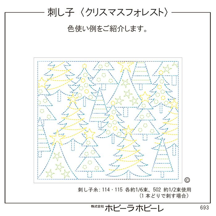 クリスマスツリーを森のように配置したデザイン。輪郭はシルバーのラメ入り刺し子糸を使って華やかに。シーズンアイテムとして、様々な用途にお使いいただけます。