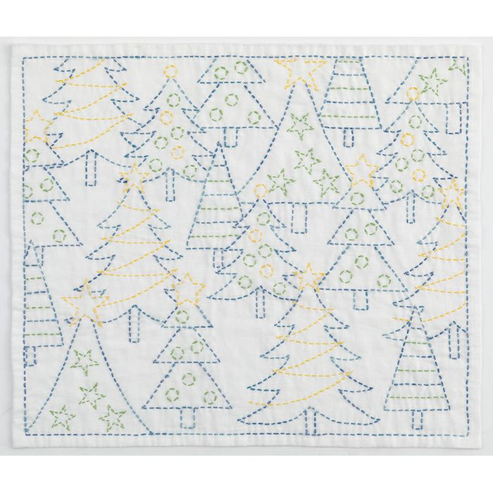 クリスマスツリーを森のように配置したデザイン。輪郭はシルバーのラメ入り刺し子糸を使って華やかに。シーズンアイテムとして、様々な用途にお使いいただけます。