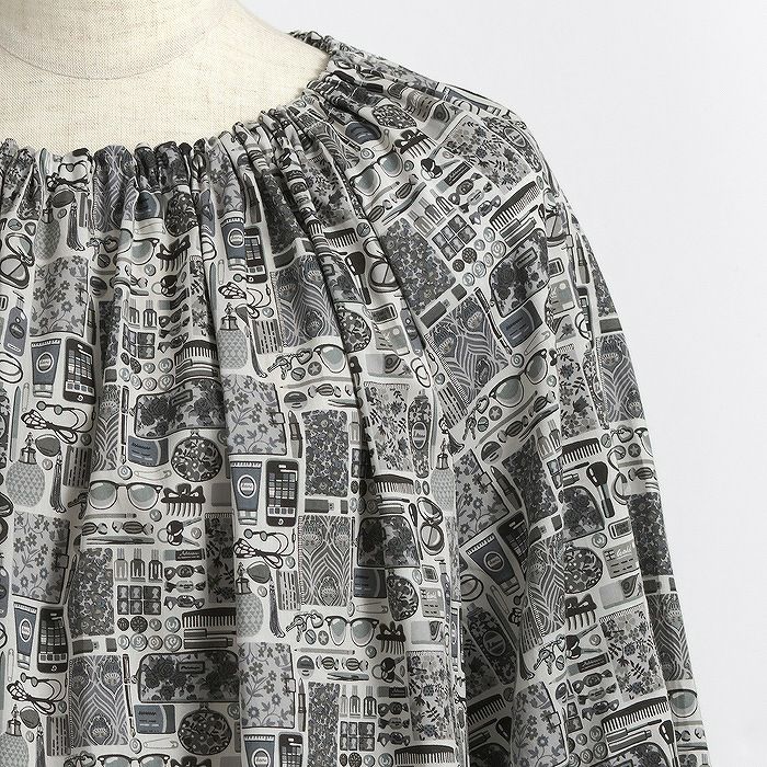 2014年春夏コレクション「ギャラリー・オブ・プリント」の中の柄で、現代のリバティレディ達のバッグの中身を表現した柄です。クラシックコレクションのリバティプリントのアドレス帳や手帳が女の子の必需品の中に混じっている、楽しいカンバセーショナル柄です。