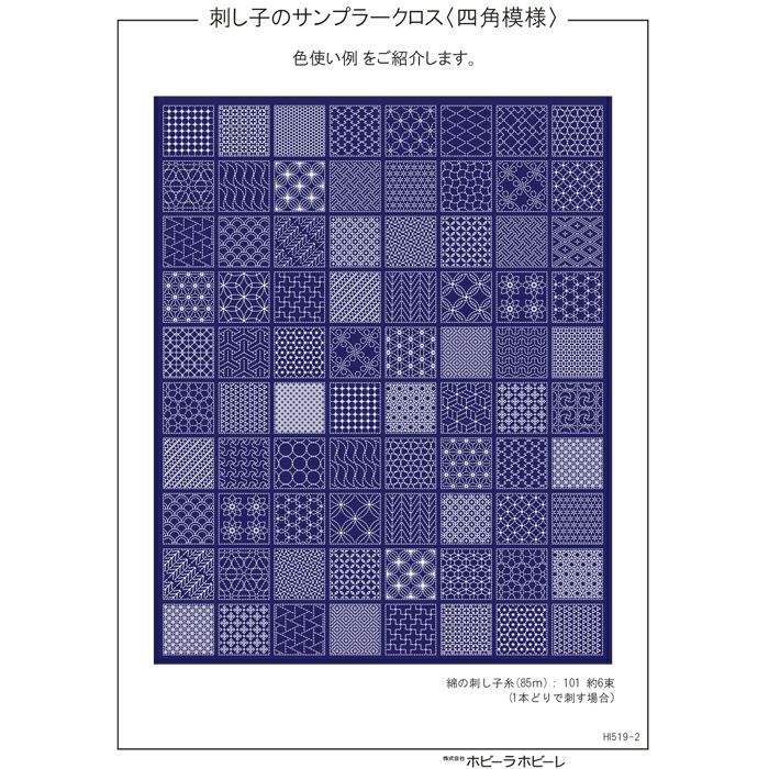 図案がプリントされた紺色のスラブコットンのみを販売。お手持ちの刺し子糸や追加糸を使って、50種の図柄をお好きな配色で刺し埋めます。正方形を均等に配置した人気の寄せ模様です。