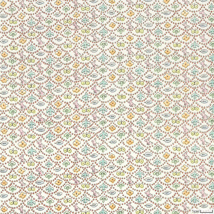 柄サイズは100%です。オレンジや水色など淡いカラーでカラフルに配色しました。ブラウスやワンピースにもおすすめです。