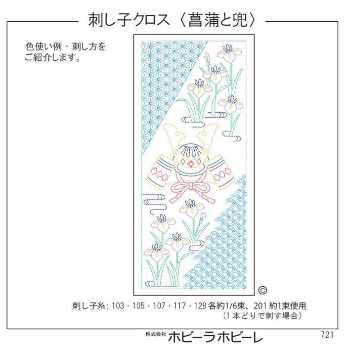端午の節句を彩る兜と菖蒲を、刺し子で表現しました。左右には伝統模様の麻の葉と青海波をあしらい、和の趣を感じるデザインです。飾っても使っても楽しめる一枚。季節のインテリアや贈り物にもおすすめです。