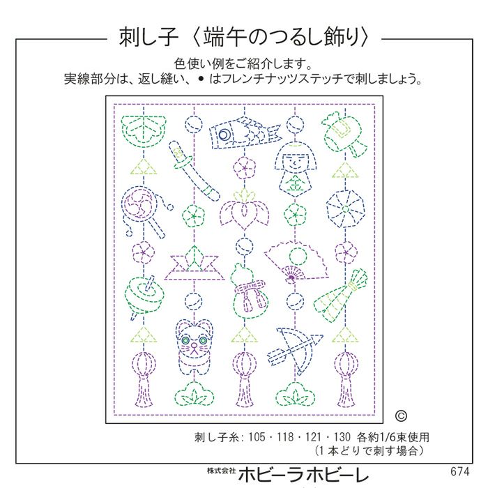 こいのぼりや金太郎など、お子様の健やかな成長を祝う節句モチーフを吊るし飾りにしたデザイン。紺やグリーン系の色を組み合わせ、愛らしく、きりりと刺し上げます。