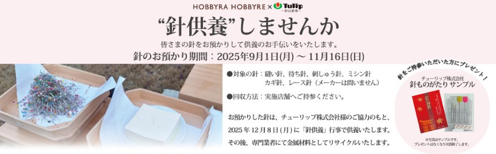 お預かりした針は、チューリップ株式会社様のご協力のもと、2025年12月8日(月)に「針供養」行事で供養いたします。