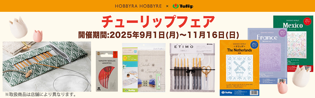 毎年大好評の〈チューリップフェア〉が、今年もホビーラホビーレに登場!人気のかぎ針セットをはじめ、チューリップブランドの魅力的なアイテムを豊富に取りそろえます。今回は、これまでホビーラホビーレで取り扱いのなかった新アイテムも加わり、さらに充実したラインアップに。手芸ファン必見のフェアです。