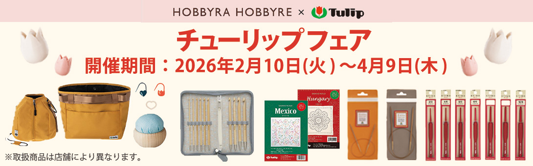 毎年大好評の〈チューリップフェア〉が、今年もホビーラホビーレに登場!人気のかぎ針セットをはじめ、チューリップブランドの魅力的なアイテムを豊富に取りそろえます。今回は、これまでホビーラホビーレで取り扱いのなかった新アイテムも加わり、さらに充実したラインアップに。手芸ファン必見のフェアです。